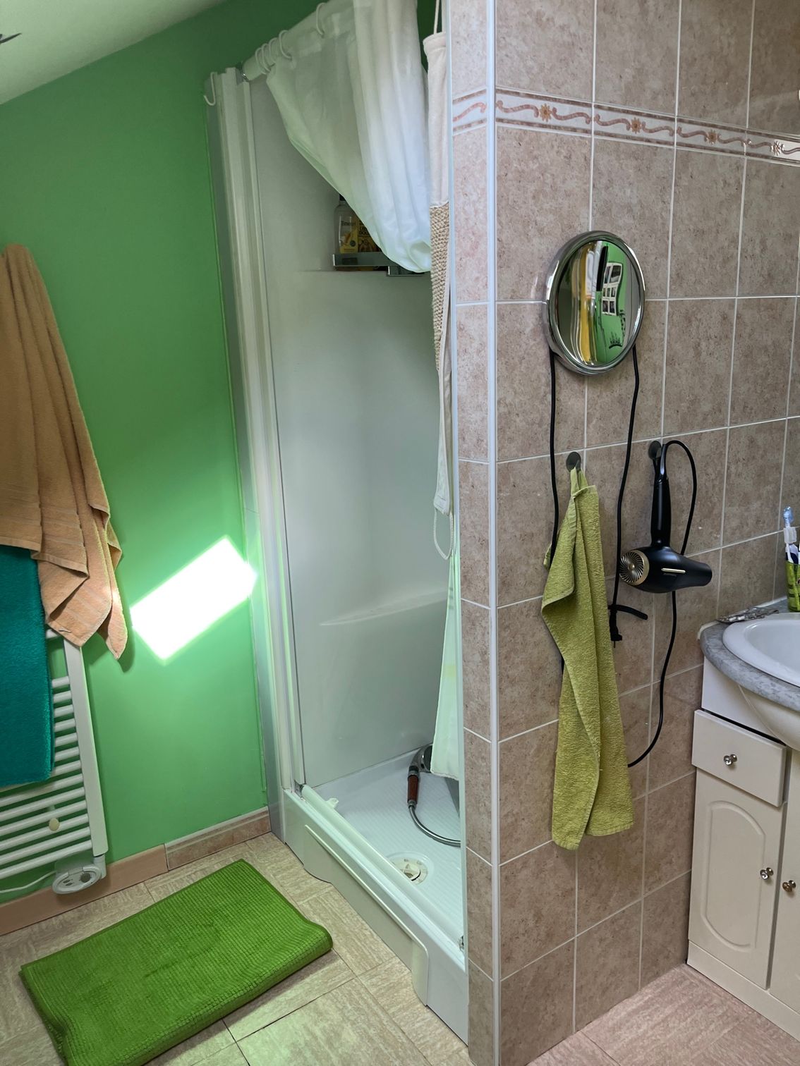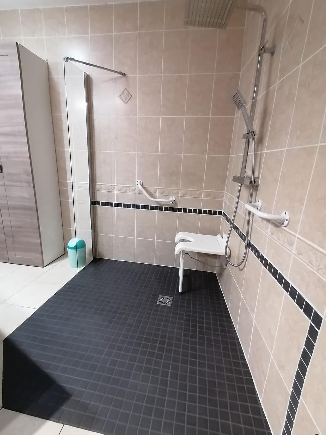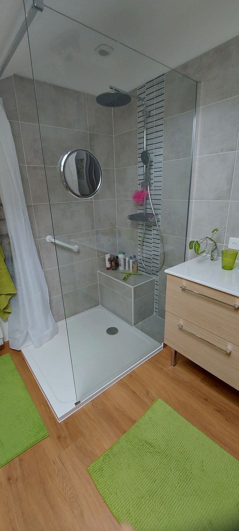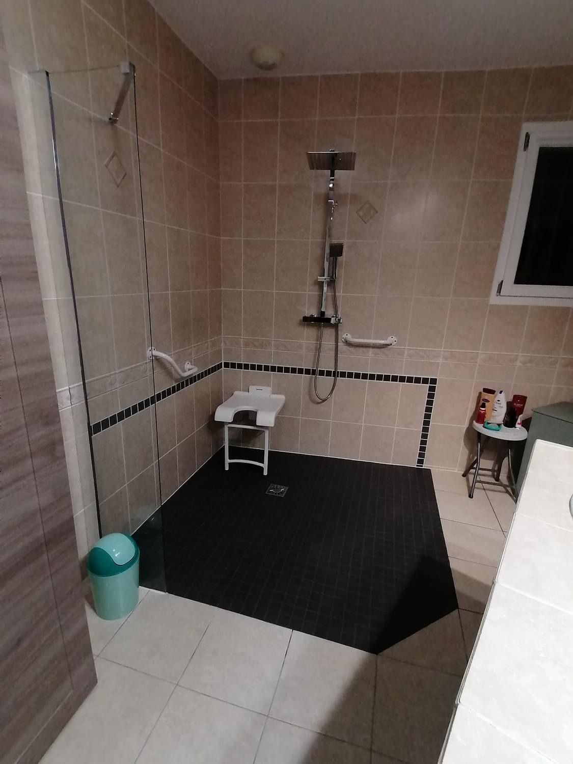 Dépose de bac receveur de douche et autres éléments sanitaires - Dépose du carrelage mural pour réfection des murs - Réaménagement des meubles vasque et douche complète.